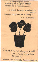 in the dew of little things The Prophet Kahlil Gibran "The Clown is very honest. There's timeless wisdom in the Clown, infinite play. She has the audience squirming one moment and laughing the next.... in the tradition of the Fool in Shakespeare." BIRMINGHAM POST "...Creates a poem with her movement...." THE STAGE "Is mesmerising throughout, assured, funny and subtle" BIRMINGHAM POST