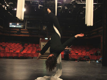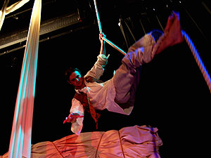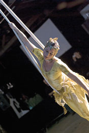 "Out of the Woods" rehearsal Photo : Shaun Parrin February 14th - June 26th 2008 "Cupid's Strongest Bow" follows on from "Soul in a Suitcase". It is a story of hearts and about not trying too hard. It is a play about the resilience of the human spirit. This kernel of humanity that seems to help us get along…which is beautiful, charming, stupid, naïve, child-like, grumpy and ultimately in this case - optimistic… A play about the journey through life and love from the heart embracing pleasure and pain, the profound and the profane, the ethereal and the mundane - (and the daft!) A piece of visual comedy that is audacious, poetic and painfully funny combining Clown play, aerial work, and music. Jane has developed the show and its physical comedy with Director John Wright author of "Why is That so Funny?" Director of aerial work is Mike Wright of "Above and Beyond". Sound design is by Pete Williams.