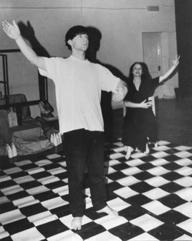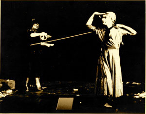 Chisenhale Dance Space London - Summer 1990 Photo - Matt Luna and Fortuna meet by chance and set off on a great adventure . Join these two clowns as they battle with the elements, fate and their own destiny. Created and performed by Lesley Moss and Jane Sutcliffe. Suitable for a family audience.