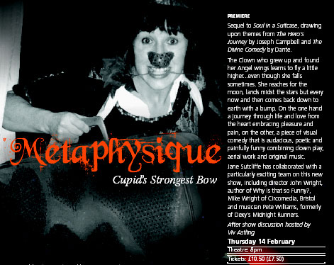 "The Journey of the Clown & Soul's Home" In conjunction with "Snowshow" by Russian Clown Slava Polunin at Birmingham Hippodrome Theatre November 2006, "The Journey of the Clown" was an Education Outreach programme led by Jane which explored the art of the Theatre Clown with students from Four Dwellings Secondary School in Quinton, Birmingham. The performance by the students was presented at Birmingham Hippodrome on November 15th 2006. Jane was commissioned by the Hippodrome to make a solo performance entitled " Soul's Home" which was also performed at Birmingham Hippodrome.