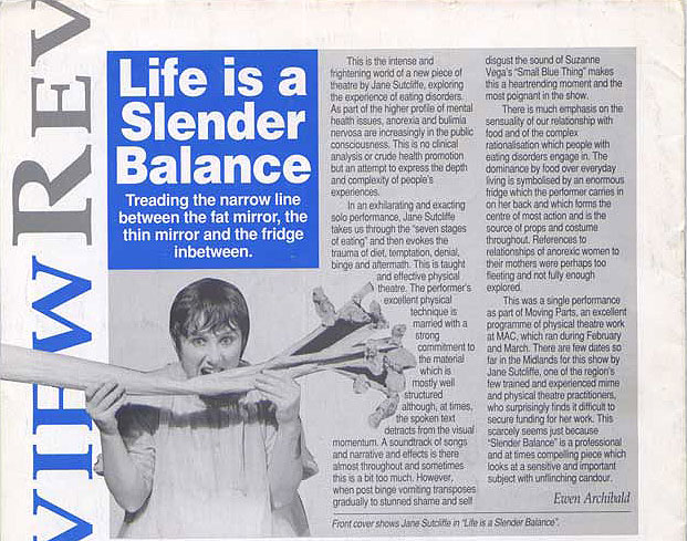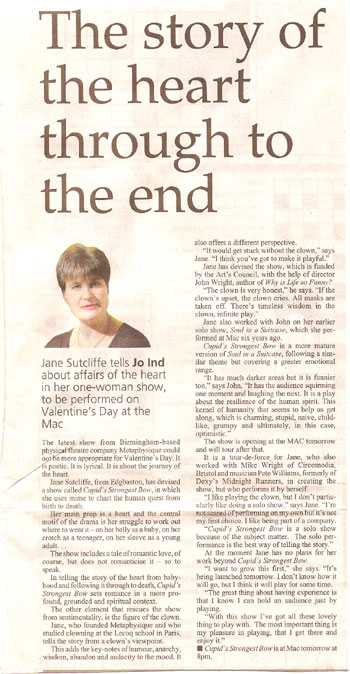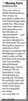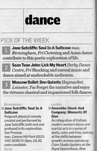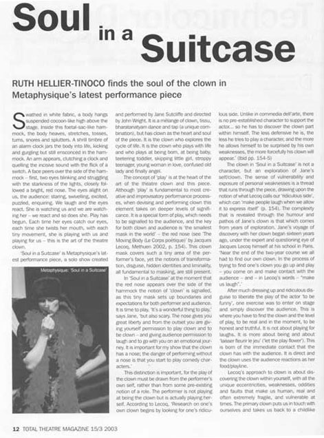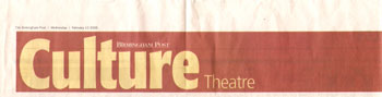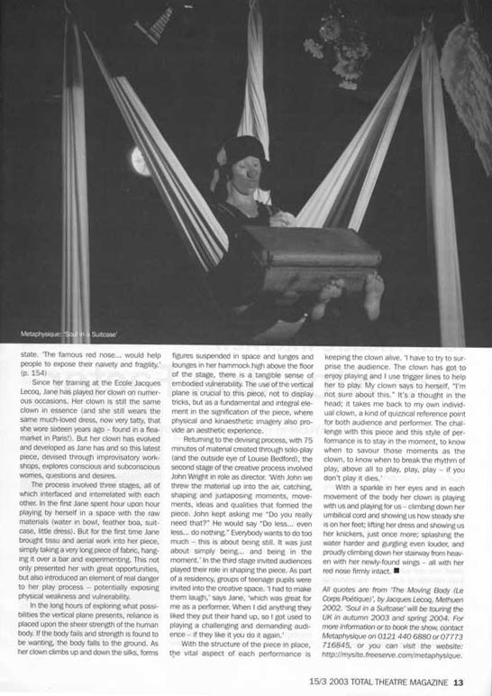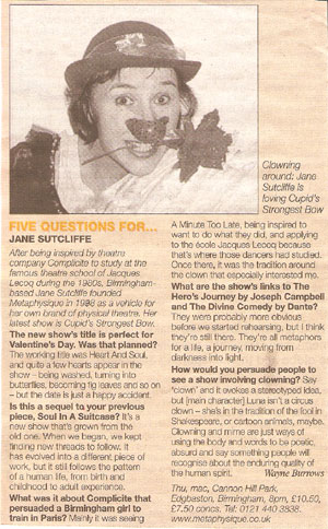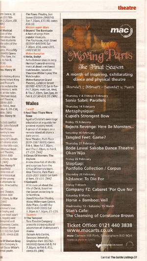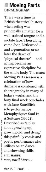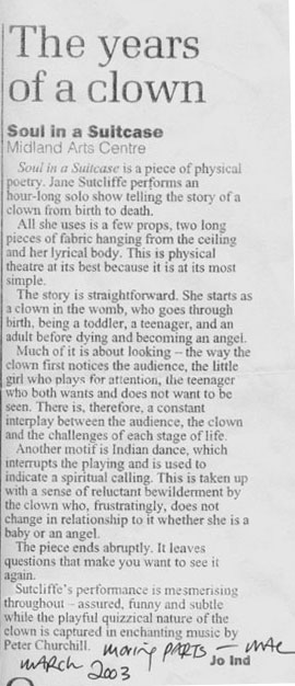 PEER GYNT Stourbridge News Peer Gynt June 2005 “How do you solve the staging problems inherent in a production of Ibsen’s rarely performed Peer Gynt? “Do it on the radio” is the solution so famously quipped in Willy Russell’s “Educating Rita”. But raved Romanian director Vasile Nedelcu’s answer is to create a fantastical epic theatrical adventure utilising more than fifty masks, puppets, live music and relying heavily on actors well-versed in the art of physical theatre. And his ambitious, painstaking undertaking at Amblecote’s Studio Theatre is to be congratulated. The 47 year old actor-turned director’s almost three hour spectacle – while a little long – is a visual feast for seasoned theatre-goers. Nedelcu uses to great effect a new theatrical space created from the ashes of a former glassmaking factory to tell the mythical story of one man’s journey across the globe to find himself. The character’s encounters with trolls, belly dancers and other weird and wonderful creatures are vividly brought to life through dizzingly choreographed scenes, effective lighting and staging, imaginative costumes – an array of masks ranging from almost humanistic features to the monstrously grotesque. The Glasshouse’s dynamic artistic director Michael Chase proves the ideal choice to bring to life the complex title role. His energy and ability to drift effortlessly from youthful, exuberant 20 something Peer to desperate old man makes for a compelling performance. Anna Wynnyczuk’s depiction of Peer’s young love Solveig is also heartfelt. But perhaps the most stand-out characters are Ingrid, the spurned lover, the troll king’s daughter (The Green Woman) – brought forcefully to life by Jane Sutcliffe; Peer Gynt’s elderly mother, lovingly and sincerely depicted by Mollie Gulifoyle and Garry Brooking’s sinister Button Moulder, who wants to melt down the ageing Peer into a nonentity. Bev Holder Chief Reporter – Stourbridge News SOUL IN A SUITCASE Click cutting to read review  Metro News Moving Parts MAC March 2003 Pick of the week The Guardian  The Birmingham Post July 2003   Total Theatre Magazine Spring 2003  L'ame a ta valise |
